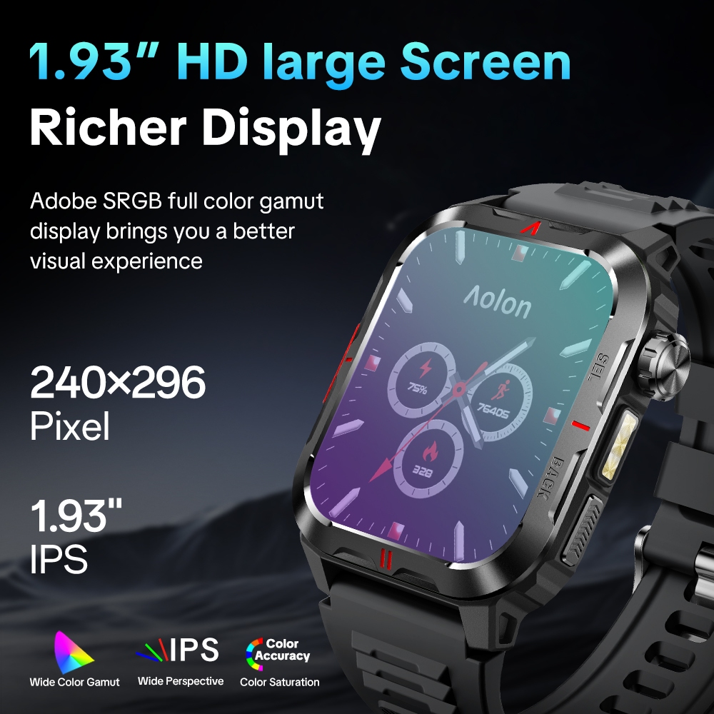Aolon Tetra S5 Smart Watch 1.93-inch HD Screen 1ATM Waterproof Watch Calls Social Media Notifications Heart Rate Monitor Flashlight Running Pace Steps Outdoor Sports Strava Smartwatch for Man Woman