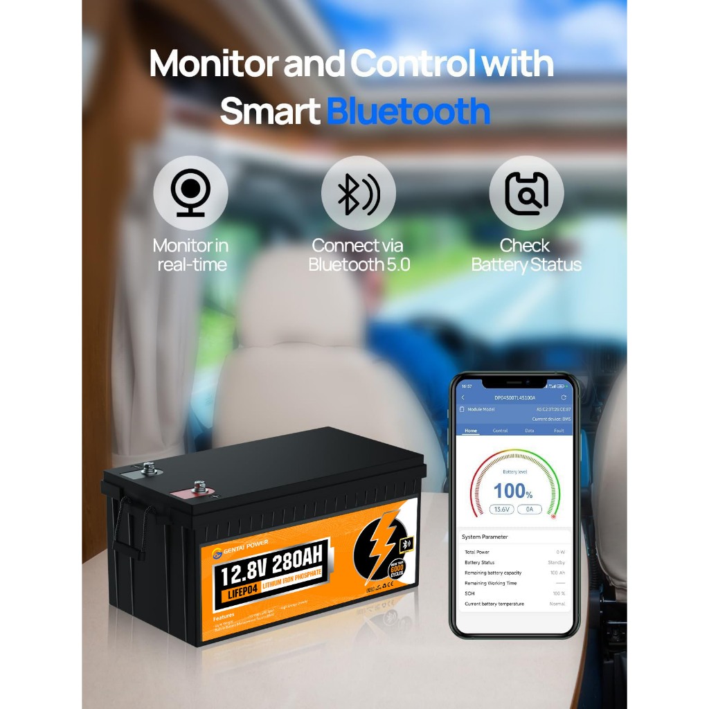 GENTAI Bluetooth LiFePO4 Battery 12V 280Ah Lithium Battery 200A BMS for Solar System, Backup Power