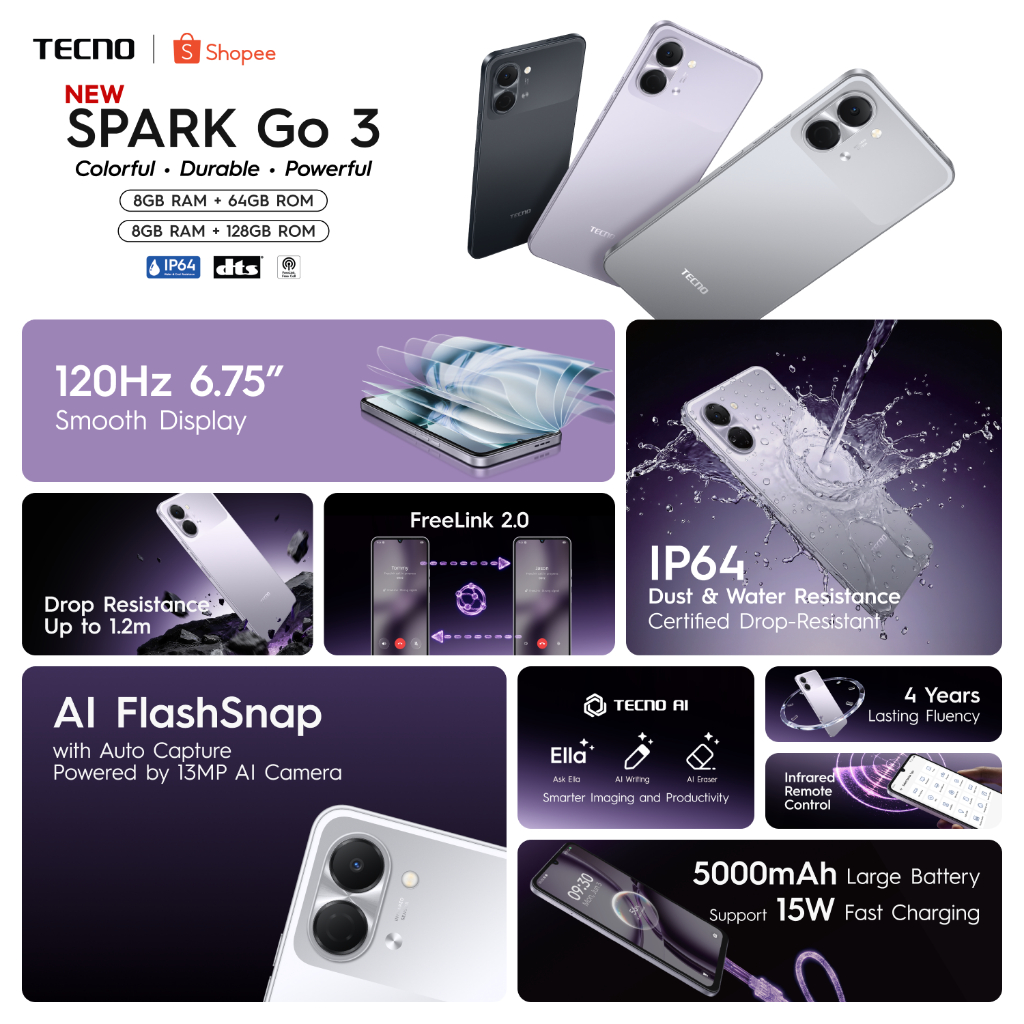 [NEW] TECNO SPARK GO 3 64/128 | Unisoc T7250 | 13MP+AI FlashSnap | 120Hz, 6.75'' HD+|IP64 | 5000mAH