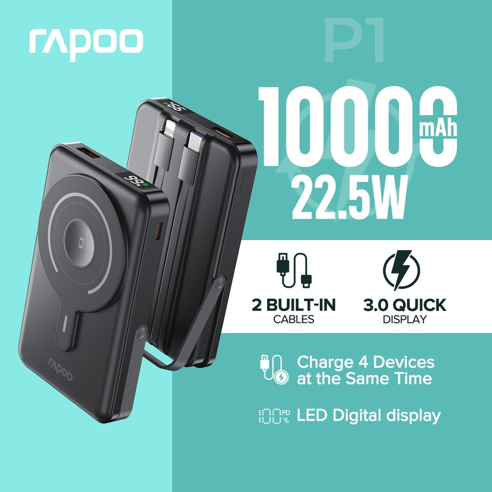 Rapoo P1 10000mAh High Capacity 22.5W Type-C Built Cable with Magnetic Fast Charging Powerbank -blck
