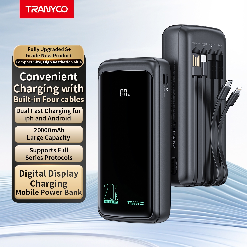 Tranyoo D11 20000mAh Power Bank Built in 4 Cables Lightning / Type-c / Micro USB/ USB Fast Charging
