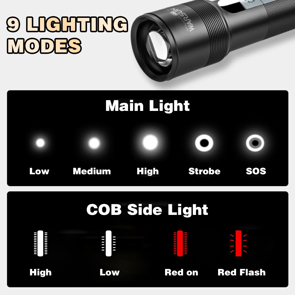 Warsun NB01 Super Bright 3000LM Hand Flashlight USB Rechargeable, IPX5 Waterproof Portable Torch for Camping Emergency Outdoor (9 Modes, 12H Runtime)